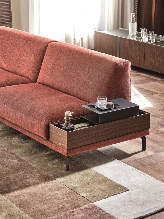 Le imbottiture della seduta e dello schienale sono realizzate con materiali di alta qualità, come piuma d’anatra o materiali ecologici, rivestiti in tessuti o pelle, offrendo un comfort superiore e una sensazione di accoglienza. Il rivestimento è completamente sfoderabile in tessuto, mentre in pelle è possibile rimuovere solo i cuscini della seduta, mantenendo la struttura e lo schienale fissi. Questa caratteristica facilita la manutenzione e consente di mantenere il divano sempre in perfette condizioni.