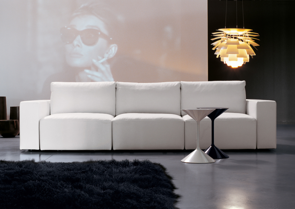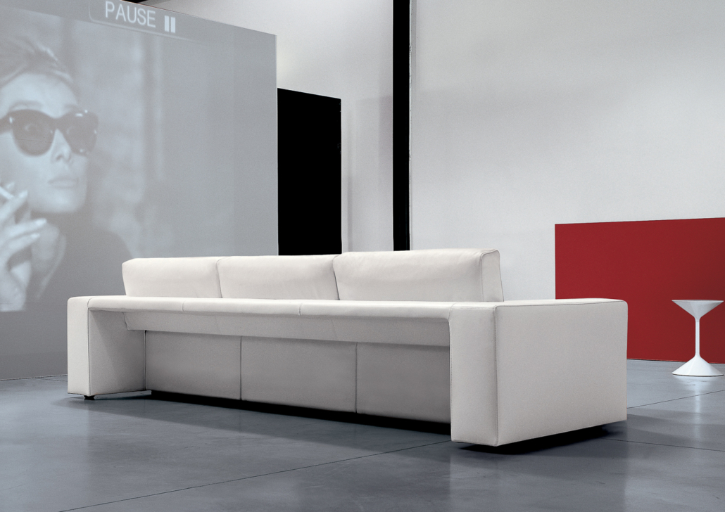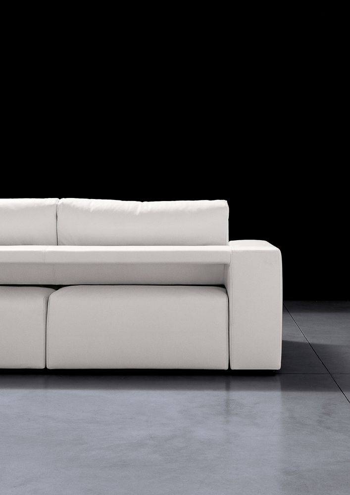 La caratteristica più distintiva del modello Genius 016 è il meccanismo integrato che permette a ciascun sedile, così come ai laterali, di avanzare in modo indipendente fino a 40 centimetri, trasformando una profondità standard di circa 110 cm in una profondità massima di circa 150 cm, quasi una chaise longue. Questo sistema non solo aumenta la comodità dell’utente, ma modula anche l’estetica del divano a seconda dell’uso, mutando la postura e la percezione visiva dello spazio.