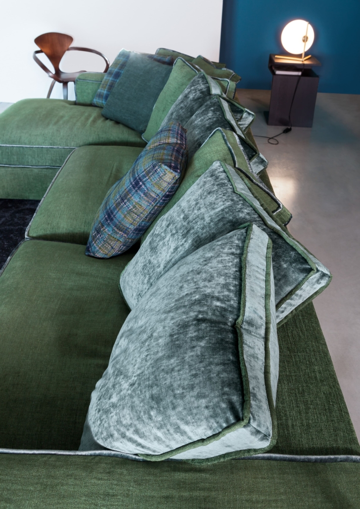 La struttura del divano Madison è realizzata in legno di abete, multistrato e fibra, materiali scelti per garantire solidità e durata nel tempo. Il molleggio è assicurato da cinghie elastiche rinforzate, che offrono un supporto ottimale e una seduta confortevole. I cuscini di seduta sono composti da una miscela di poliuretano espanso indeformabile e piuma d’oca sterilizzata, mentre quelli di schienale combinano piuma d’oca e fibra di poliestere. Questa combinazione di materiali conferisce al divano un aspetto destrutturato e morbido, con forme dei cuscini volutamente irregolari che ne accentuano il carattere informale e accogliente.