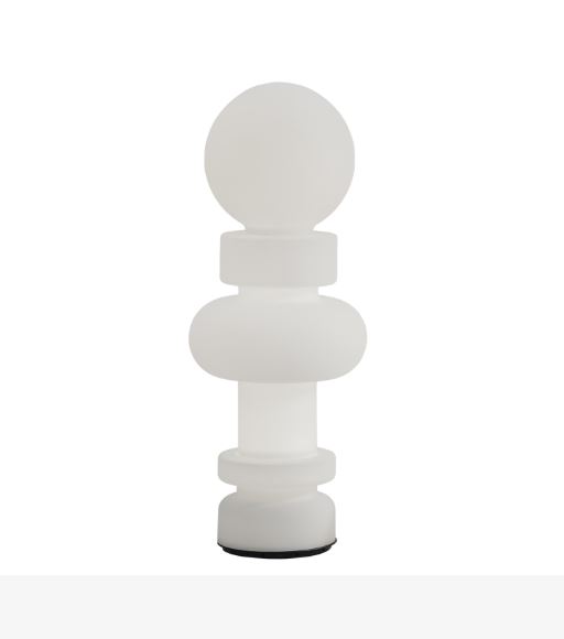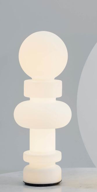 Questa lampada si presenta con una verticalità precisa, composta da volumi in vetro soffiato satinato, accostati l’uno all’altro con un ritmo ritmico e cadenzato, quasi come i pezzi di una scacchiera trasposti nello spazio dell’abitare. Il diffusore in vetro opalescente restituisce una luce morbida, avvolgente, che non solo illumina ma plasma l’ambiente circostante.