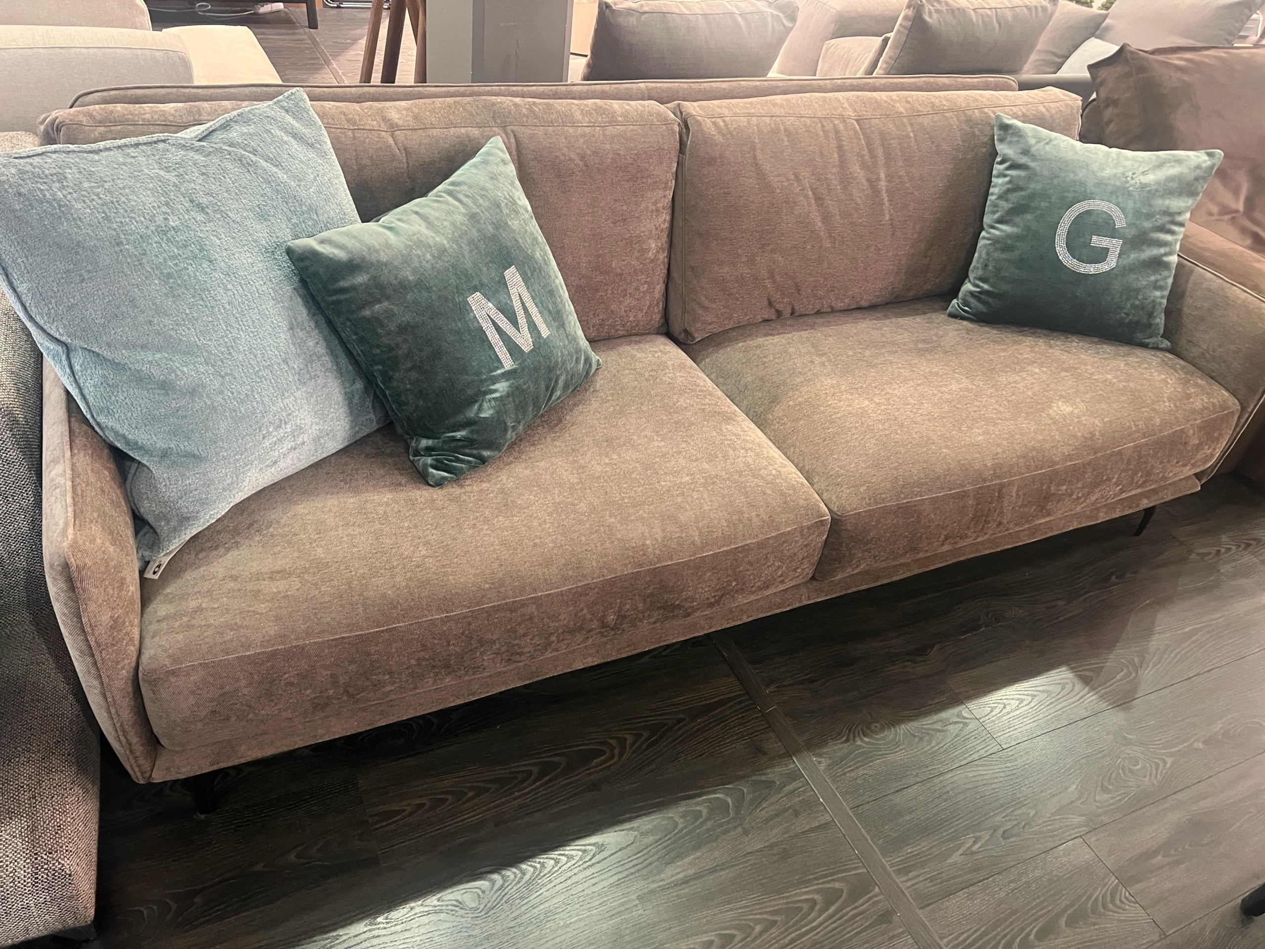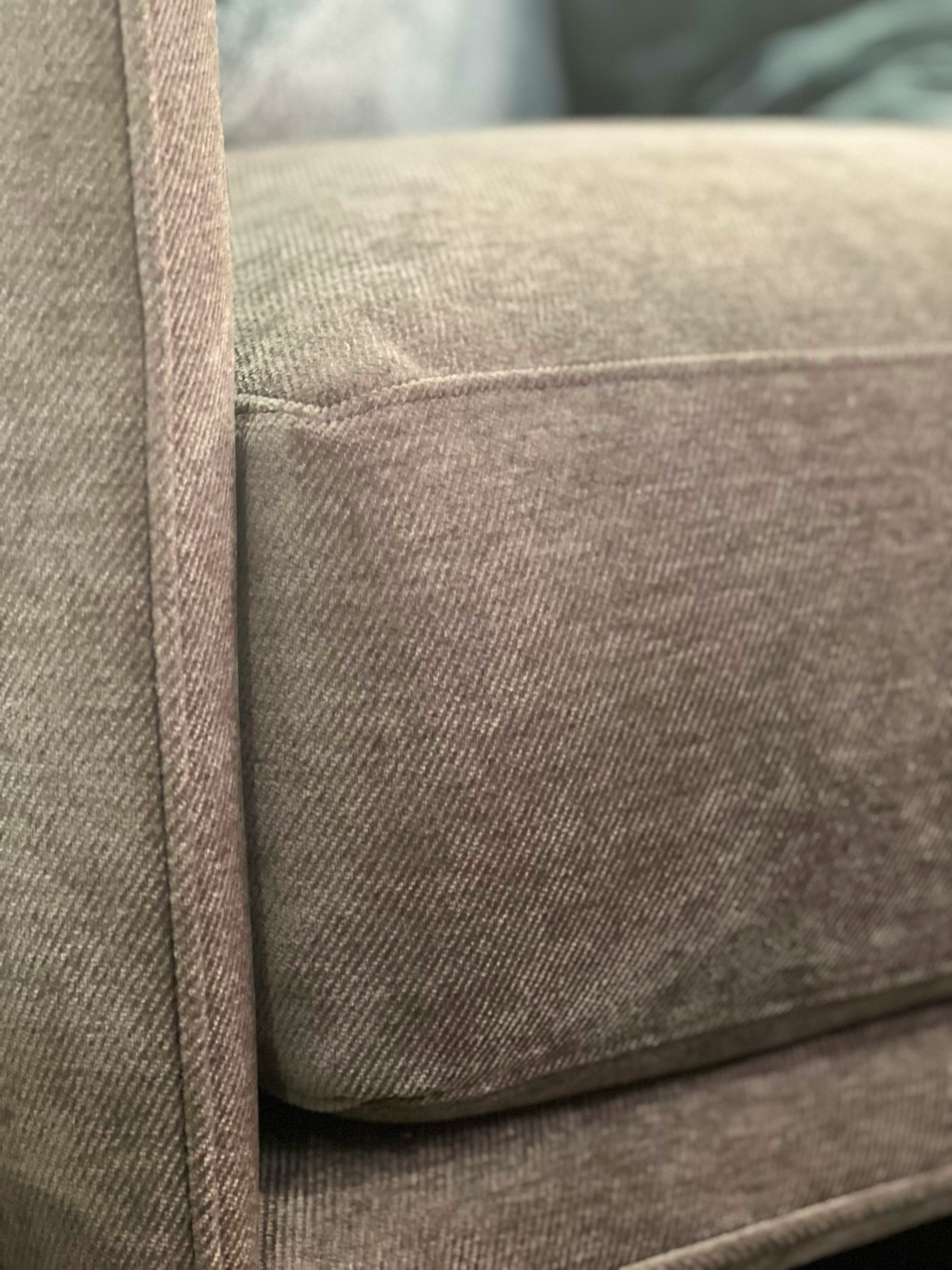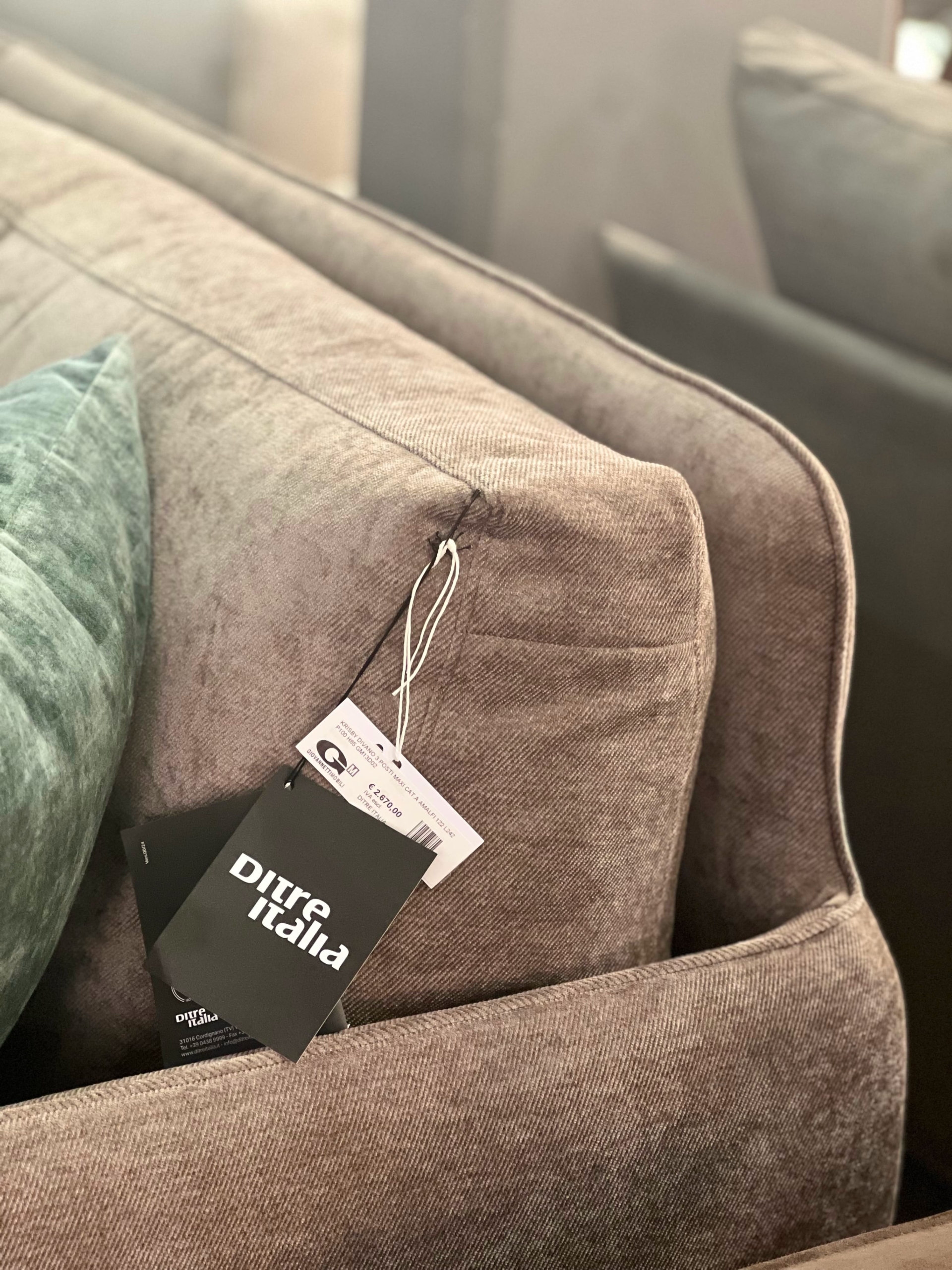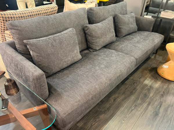 L’imbottitura combina poliuretano espanso indeformabile e piuma d’oca (nei cuscini dello schienale), dando quel mix di sostegno e morbidezza tipico dei divani di alta fascia.