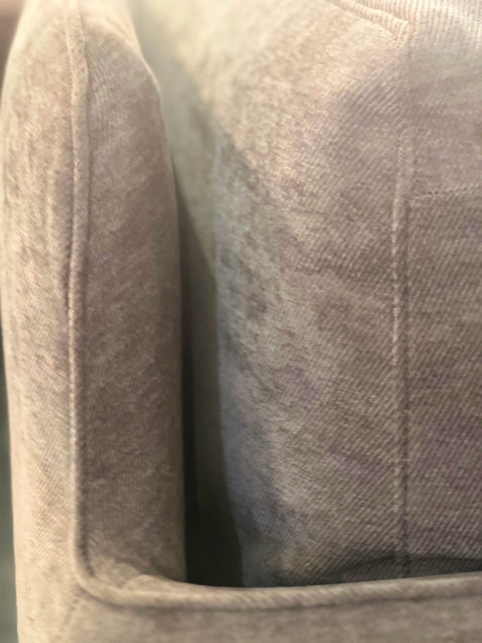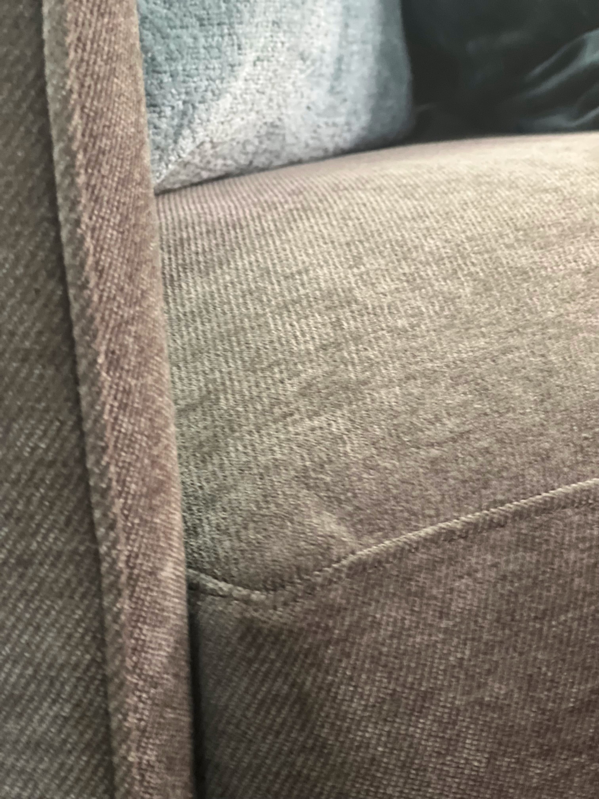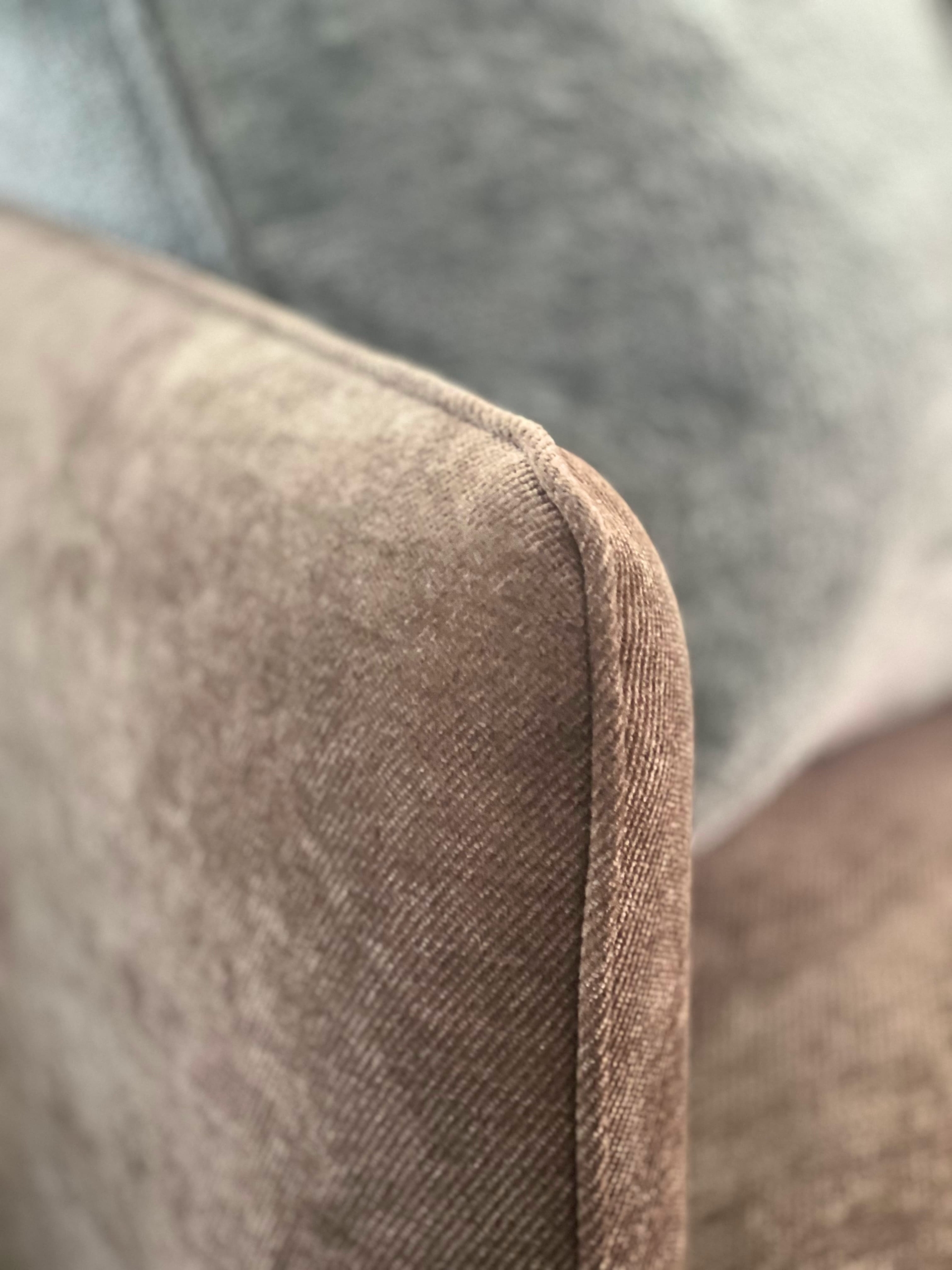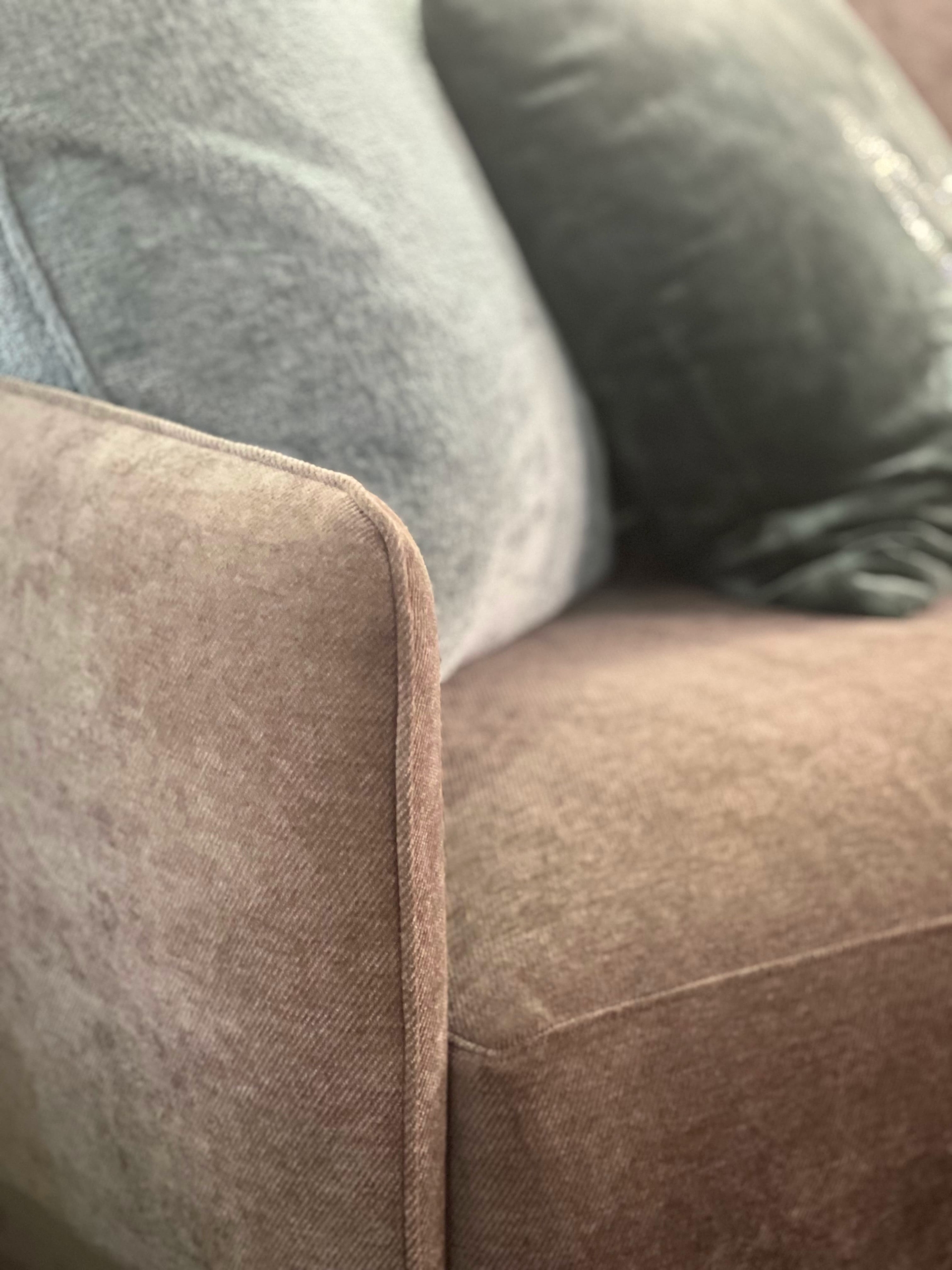 Un altro aspetto distintivo è la presenza di due varianti di bracciolo libero: nella versione più “soft” il bracciolo è imbottito con piuma morbida, pensato per un effetto più rilassato e accogliente; nella versione più rigorosa, il bracciolo assume una forma “a scatoletta”, con bordi più netti e un profilo più grafico.