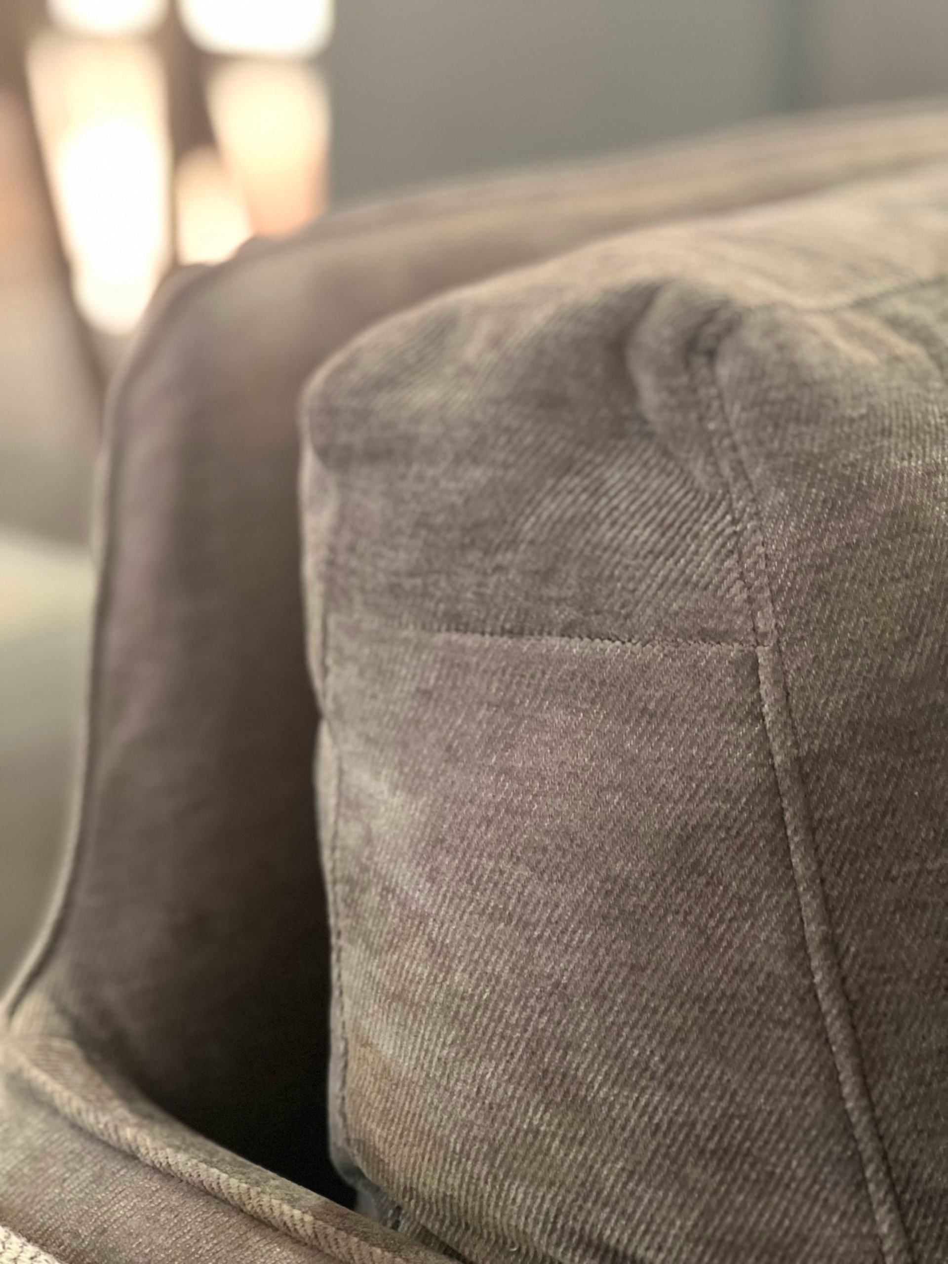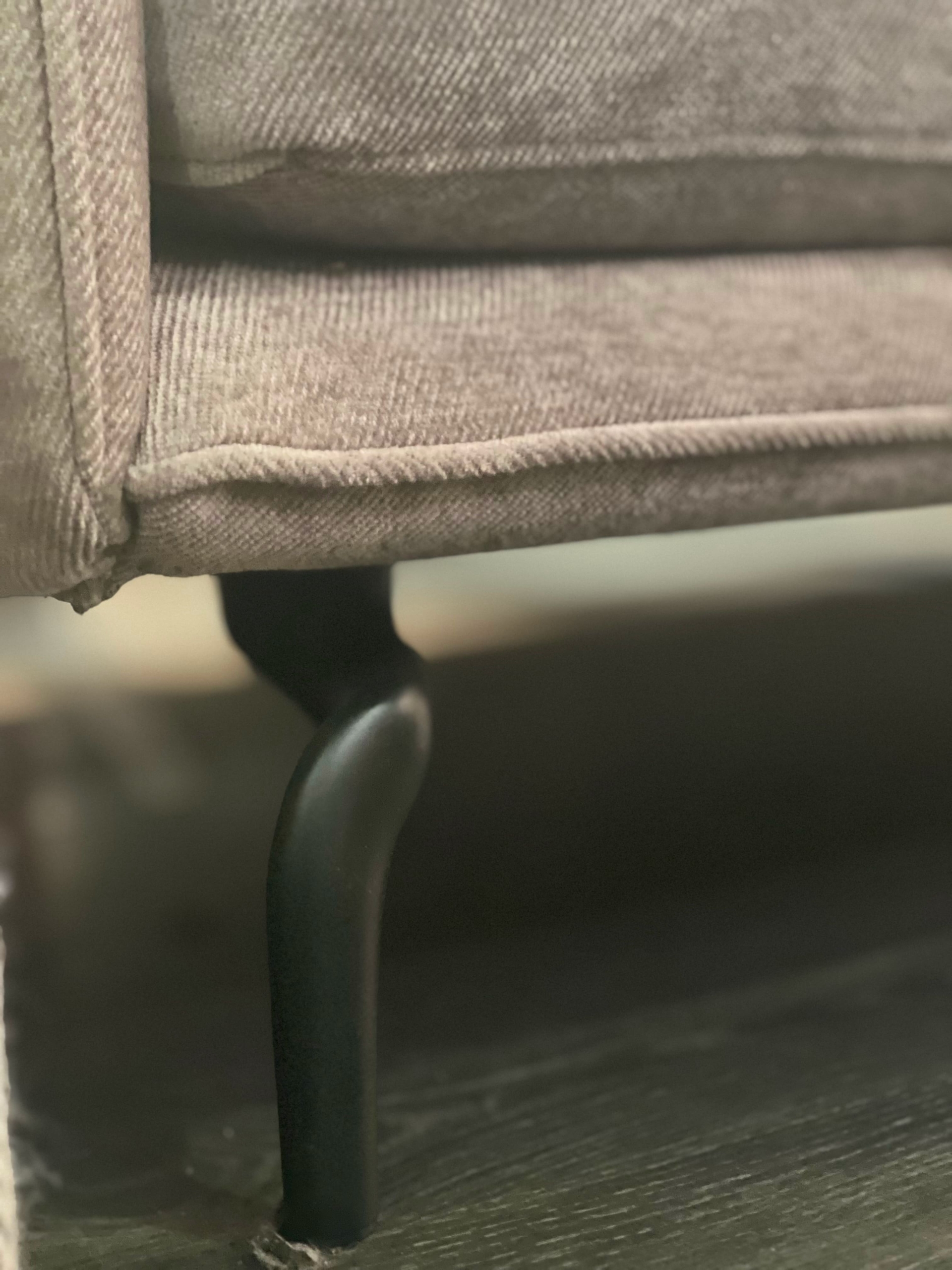 Il primo elemento che salta all’occhio è il piedino del divano: realizzato in lega metallica e dalle linee fluide, sostiene la struttura con leggerezza visiva, sollevandola leggermente da terra e conferendo un senso di dinamismo e leggerezza.
