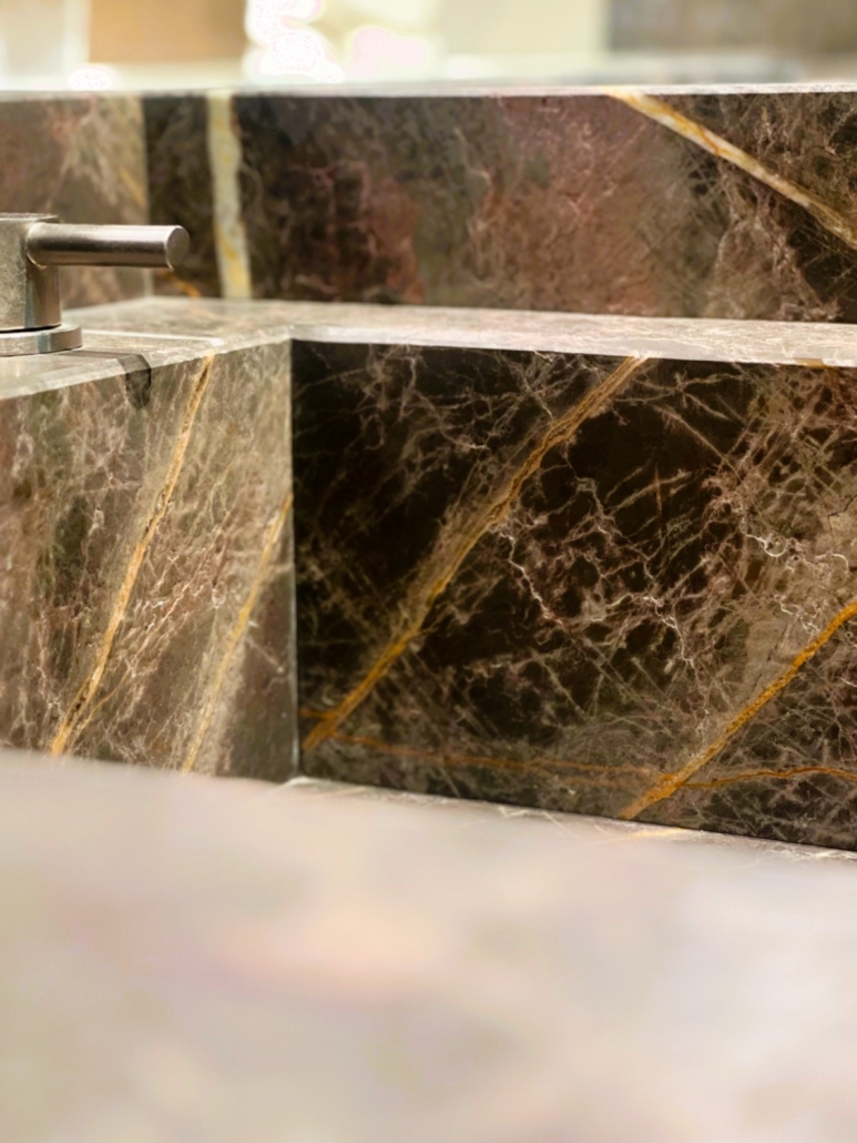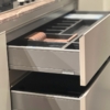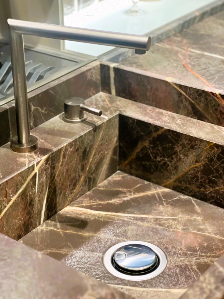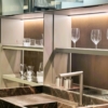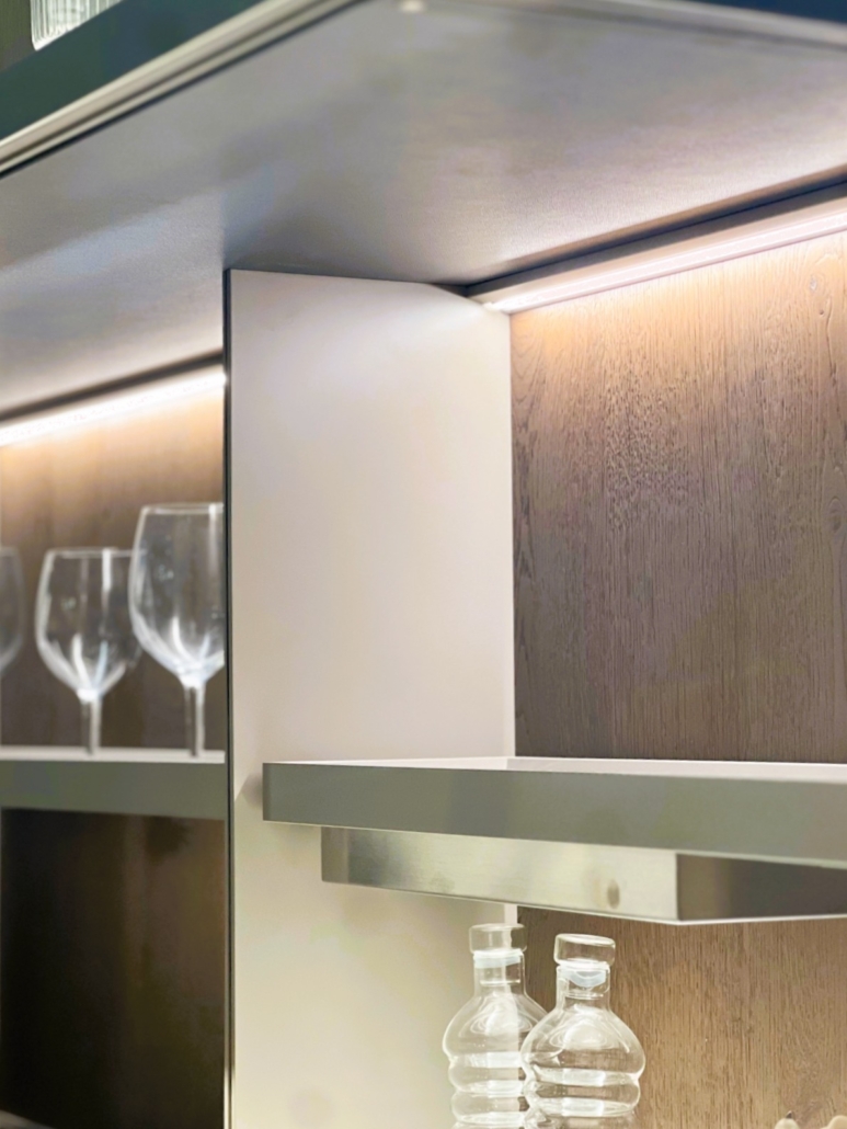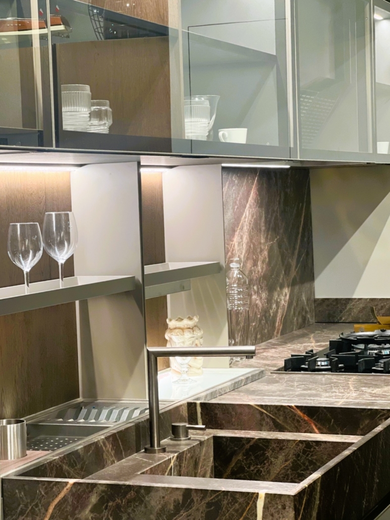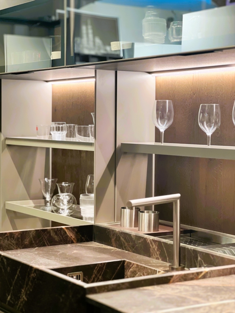 La Ernestomeda Soul si distingue innanzitutto per il modo in cui coniuga funzionalità ed edonismo: ogni elemento è pensato per soddisfare l’esigenza pratica, ma anche il desiderio estetico, l’“anima” che dà significato a un’abitazione. Il sistema Medley, per esempio, è un’apparente scaffalatura ma è molto di più: può diventare retrobase attrezzata, libreria freestanding, mobile contenitore, oppure dotarsi di accessori come scolapiatti, portabicchieri, vasche integrate nel basamento per la raccolta dell’acqua, trasformando superfici piane in aree dinamiche. La scelta di materiali come l’impiallacciato in rovere termotrattato, i legni dalle finiture nobili, i marmi o le pietre naturali per i piani, o le finiture metalliche effetto laccato, arricchisce Soul di un fascino “vissuto”, che ricorda il vintage ma filtrato attraverso un rigoroso gusto moderno.